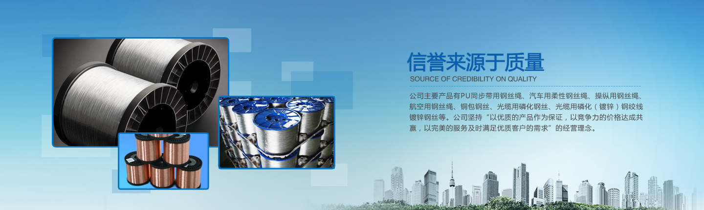 公司主要產(chǎn)品有PU同步帶用鋼絲繩、汽車用柔性鋼絲繩、操縱用鋼絲繩、航空用鋼絲繩、銅包鋼絲、光纜用磷化鋼絲、光纜用磷化(鍍鋅)鋼絞線、鍍鋅鋼絲等。經(jīng)過多年的研究、摸索、開發(fā),公司已形成了完整的技術、工藝軟件,產(chǎn)品實物質(zhì)量均達到國際先進水平。